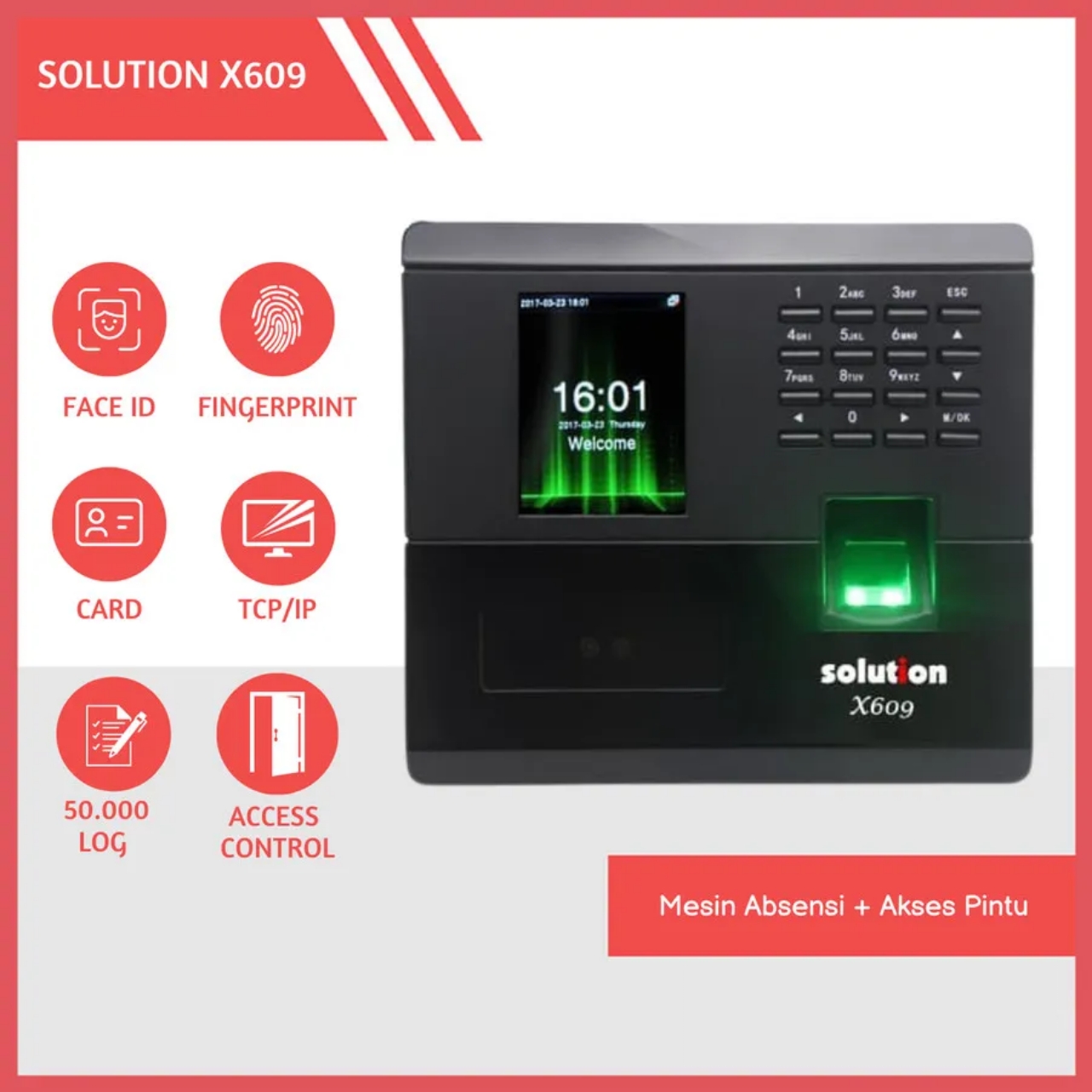 Solution X609 dirancang untuk menjawab kebutuhan perusahaan modern akan sistem keamanan dan pencatatan kehadiran yang akurat. Berbeda dengan mesin absensi konvensional, X609 menonjolkan kemampuan “Dual Biometric” yang menggabungkan sensor pemindai sidik jari presisi tinggi dengan kamera inframerah yang mampu mendeteksi wajah dalam kondisi pencahayaan minim sekalipun.